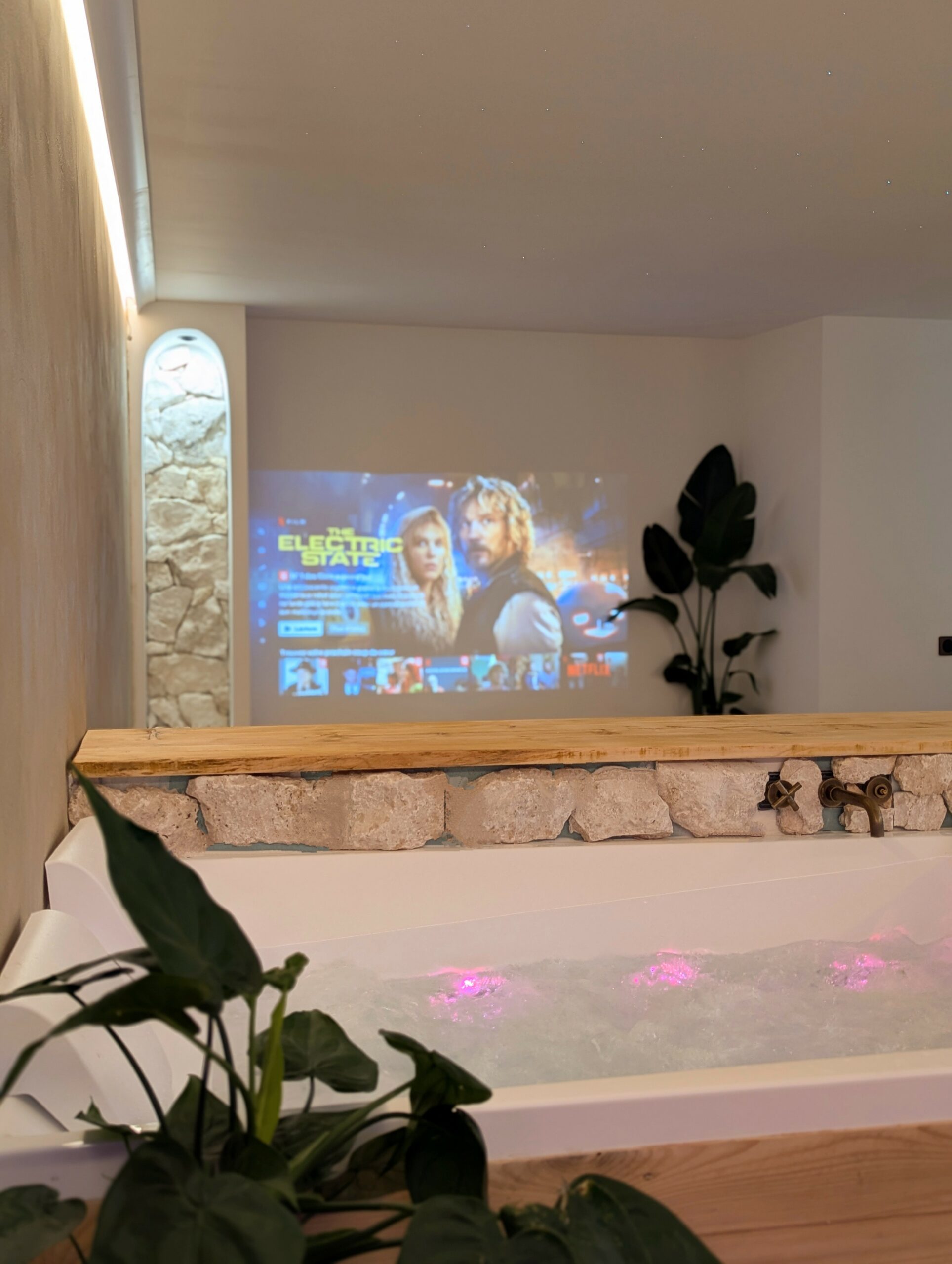 L’ambiance se prolonge grâce à un ciel étoilé, créant une atmosphère douce et enveloppante, et à un vidéoprojecteur, idéal pour transformer vos soirées en véritables moments de cinéma.